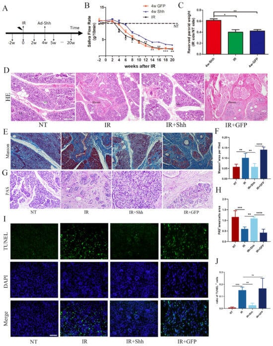 - Hai, B.; Qin, L.; Yang, Z.; Zhao, Q.; Shangguan, L.; Ti, X.; Zhao, Y.; Kim, S.; Rangaraj, D.; Liu, F. Transient activation of hedgehog pathway rescued irradiation-induced hyposalivation by preserving salivary stem/progenitor cells and parasympathetic innervation. Clin. Cancer Res. 2014, 20, 140–150. [Google Scholar] [CrossRef] [PubMed]