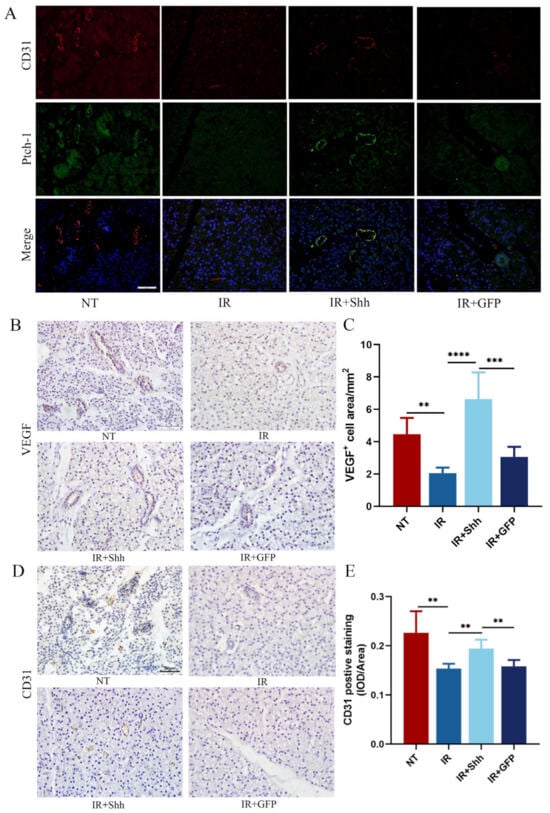 Shh transduction increased microvascular density in the parotid gland after IR. (A) The expression of PTCH1 and CD31 in parotid glands harvested 20 weeks after IR was assessed by double immunofluorescence staining. (B,C) IHC showed a significant decrease in the expression level of VEGF in the parotid glands of miniature pigs after IR. However, Shh gene therapy markedly increased VEGF secretion and effectively preserved vascular function after injury. The ratio of the VEGF-positive area in each visual field was calculated Scale bar, 50 μm; n = 5. (D,E) The expression of CD31 serves as a reliable marker for identifying endothelial cells. Immunohistochemical analysis revealed a significant reduction in microvascular density within the parotid gland following irradiation, while Shh gene therapy exhibited the potential to mitigate this alteration. The mean optical density of CD31+ cells in each field of view was calculated and subjected to statistical analysis. Scale bar, 50 μm; n = 5. The data are shown as the mean ± standard error of the mean (SEM); ns (not significant), ** (p < 0.01), *** (p < 0.001), and **** (p < 0.0001) indicate significant differences.