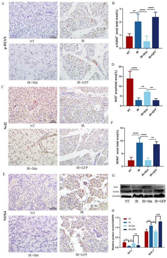 Oxidative stress represents a significant early change following radiotherapy, frequently resulting in DNA double-strand breaks (DSBs). The phosphorylation of histone H2AX (p-H2AX) serves as a crucial marker of DSBs. The levels of p-H2AX were significantly increased after radiotherapy, which suggests that oxidative stress-induced damage was initiated in the gland. Following Ad-Shh gene therapy, the Hh signaling pathway was activated, p-H2AX levels were significantly reduced, and oxidative stress was alleviated (Figure 3A,B). Nrf2 and NOX4 are important proteins in the body that regulate oxidative stress levels. IHC staining showed that IR significantly downregulated Nrf2 levels and increased NOX4 levels. Activation of the Hh signaling pathway may regulate the level of oxidative stress through upregulation of Nrf2 and downregulation of NOX4, thereby playing a role in reducing oxidative stress-induced damage (Figure 3C–F). Subsequent Western blot analyses further verified that after Ad-Shh transduction, Nrf2 and NOX4 may be regulated to effectively reduce oxidative stress-induced damage to the parotid glands of miniature pigs (Figure 3G,H).