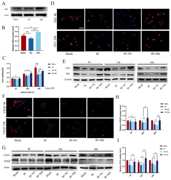 Shh gene overexpression activates the Hh signaling pathway and enhances vascular function in endothelial cells. (A,B) The protein expression level of Shh in the HUVECs in each group was detected by Western blotting, n = 3. (C) A CCK-8 assay revealed that Shh gene overexpression alleviated the inhibitory effect of IR on endothelial cell proliferation. n = 3, * p < 0.05. (D,E) Western blot and immunofluorescence staining results revealed that the Hh signaling pathway was significantly inhibited at 4 h, 24 h, and 48 h after IR. Furthermore, overexpression of the Shh gene was observed to activate the Hh signaling pathway and upregulate Gli1 expression. (F) IF staining revealed that compared with that in the blank group, VEGF expression in the IR and IR+NC groups was significantly lower at 4 h and 48 h after IR, whereas VEGF expression in the IR+Shh group was greater than that in the control group. Scale = 50 μm. (G–I) Western blot results and subsequent quantitative analysis revealed that overexpression of the Shh gene promoted the expression of CD31 and VEGF and restored vascular function in endothelial cells; n = 3, * p < 0.05. The data are shown as the mean ± standard error of the mean (SEM); ns (not significant), * (p < 0.05), ** (p < 0.01) and *** (p < 0.001) indicate significant differences.