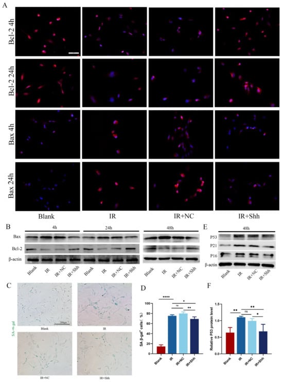 The primary mechanism of cell death induced by IR is apoptosis. Immunofluorescence and Western blot analysis demonstrated that the expression levels of p53 and Bax were elevated in the IR and IR+NC groups compared with those in the blank group (Figure 5A,B,E,F). Conversely, the expression of the antiapoptotic factor Bcl-2 was significantly reduced (Figure 5A,B). The overexpression of Shh was observed to reduce endothelial cell apoptosis by upregulating Bcl-2 and downregulating p53 and Bax. The results of β-gal staining and quantitative analysis revealed that the number of β-gal-positive cells in the IR+Shh group was significantly lower than in the IR and IR+NC groups (Figure 5C,D, n = 3, ** p < 0.01, * p < 0.05). Subsequently, we found that radiotherapy significantly induced cell senescence, resulting in upregulated protein expression levels of p21 and p16, which are related to cell senescence. However, overexpression of shh could effectively inhibit cell senescence (Figure 5E). These findings indicate that activation of the Hh signaling pathway may mitigate the detrimental effects of ionizing radiation on endothelial cells by modulating the apoptosis signaling pathway.