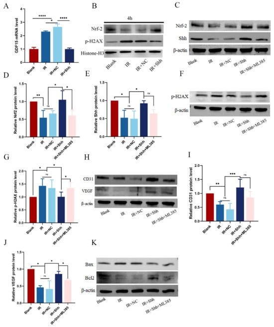 Protein lysates (RIPA:PMSF:PIC = 100:1:1) were prepared, and total cellular proteins were extracted on ice. The protein concentration was determined by the Bradford method (Bio-Rad Laboratories, Hercules, CA, USA). Protein fractions were separated by sodium dodecyl sulfate–polyacrylamide gel electrophoresis (SDS–PAGE) and transferred to PVDF membranes. The membranes were incubated overnight at 4 °C with the following primary antibodies: Shh (1:1000, ABclonal A7726, Wuhan, China), Gli1 (1:5000 Proteintech), VEGF (1:300, Bioss BS-1313R), CD31 (1:1000, Abcam ab281583), Bcl-2 (1:2000, Abcam), Bax (1:1000, Abcam), p53 (1:1000, Proteintech), Nrf2 (1:1000, Proteintech 16396-1), p-H2AX (1:1000, CST 80312), and β-actin (1:50,000, ABclonal). The Western blot analysis was repeated three times, and the proteins were quantified using Image J1 software.