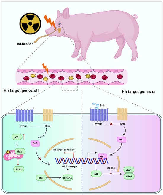 Endothelial cells are the most sensitive cell type in the blood vessel wall to ionizing radiation, as radiation above 10 Gy can cause severe endothelial cell dysfunction and apoptosis []. Ionizing radiation causes DNA breakage in endothelial cells, and cell aging results in slow cell growth, which manifests as increased vascular permeability in vivo. Radiation-induced DNA damage also leads to the activation of the ataxia telangiectasia mutated gene (ATM) and DNA-dependent protein kinases, which phosphorylate p53 and trigger cell cycle arrest []. Bcl-2 is an oncoprotein found in cancer proteins in the nuclear membrane, some mitochondria, and the outer membrane that can protect cells from apoptosis. p53 can be used as a proapoptotic factor to guide the transcription and translation of the Bcl-2 family. Bax is an apoptosis regulatory gene that forms a heterodimer with Bcl-2 in vivo, and high expression of Bcl-2 inhibits apoptosis. In one study, when Bax was highly expressed, a homologous dimer was formed, and apoptosis was promoted. The overexpression of Shh inhibited the expression of SA-β gal and p53. Shh gene overexpression upregulated Bcl-2 and downregulated Bax expression after IR. However, when endothelial cells overexpressing Shh were treated with the Nrf2-specific inhibitor ML385 prior to IR, this protective effect disappeared, which suggests that Nrf2 may be located downstream of Shh. These findings suggest that Hh pathway activation can protect endothelial cells from radiation damage by activating Nrf2, alleviating DNA damage and oxidative stress, and inhibiting apoptosis through the p53 pathway.