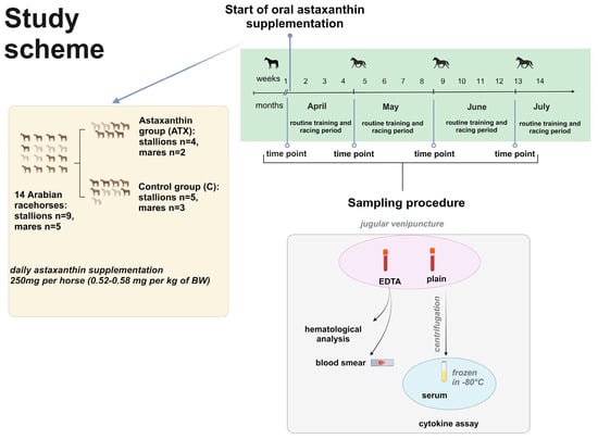 Currently, astaxanthin (ATX) supplementation for horses is gaining increasing interest. It is commercially recommended for various groups of healthy horses, including those engaged in moderate to heavy work, as well as growing and elderly ones. Additionally, the use of ATX is widespread in injured, immune-compromised, and allergic horses [,,], as well as horses with muscle disorders such as tying-up syndrome or polysaccharide storage myopathy (PSSM). In racehorses, antioxidants have been proposed as supplements reducing inflammation in the musculoskeletal system [,] and airways []. Due to the strong antioxidant properties of ATX and the fact that the mechanism by which it limits exercise-induced muscle damage has been recognized in mice [], it is widely considered as a supplement for human athletes [] and seems to be a perfect candidate also for horses. Additionally, antioxidants including ATX are not currently forbidden by anti-doping regulations.
