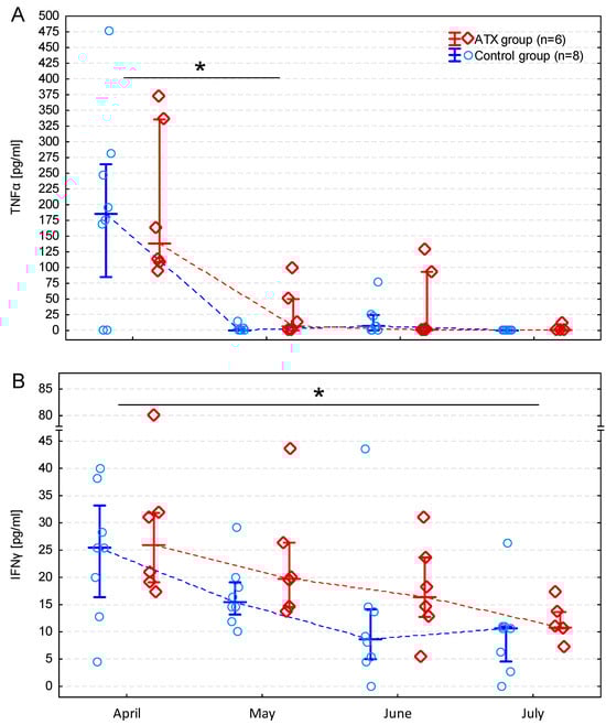 Changes in tumor necrosis factor α (TNFα) (A) and interferon γ (IFNγ) (B) concentrations in the subsequent months presented as medians, interquartile ranges, and individual measurements in the astaxanthin (ATX) and control groups. Asterisks (*) indicate significantly different time points according to the Wilcoxon signed-rank test.