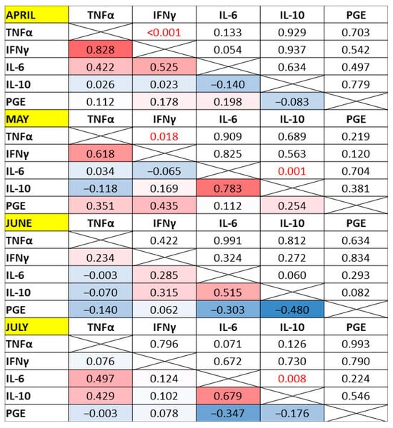 The concentrations of TNFα, IFNγ, IL-6, IL-10, and PGE did not differ significantly between groups; however, the time effect was significant in terms of TNFα and IFNγ (Table 3). The concentration of TNFα was the highest in April, then decreased significantly in May (p = 0.009) and remained significantly lower in June (p = 0.015) and July (p = 0.007) (Figure 2A). Similarly, the concentration of IFNγ was the highest in April and then decreased gradually, reaching a significantly lower value in July (p = 0.006) (Figure 2B). The concentrations of IL-6 and IL-10 did not change significantly during the study period (Table 3).