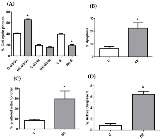 Caco-2 cell death studies by flow cytometry after incubation for 48 h with 1500 μg/mL (IC50) B. edulis extract (BE). (A) Percentage of cells in different phases of the cell cycle. (B) Percentage of cells in the apoptotic state. (C) Percentage of cells with disturbed mitochondrial membrane potential (ψ). (D) Percentage of cells with active caspase 3. * p < 0.05 compared to control (without treatment).
