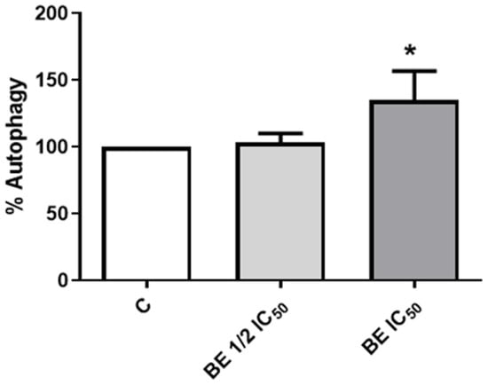 In our research, we investigated the effects of autophagy cell death. Our findings, presented in Figure 3, indicate that BE extracts induce a moderate formation of autophagosomes, thereby inducing autophagy. Trehalose, a significant component of the BE extract, has been demonstrated to exert apoptotic and autophagic effects [85,86]. Moreover, numerous studies have verified that phenolic compounds, which are present in the BE extract, can effectively regulate autophagy in various types of cancer [87]. A number of authors have reported the action of different mushroom extracts (including Antrodia salmonea, Antrodia cinnamonea, Phellinus linteus, Ganoderma lucidum, and others) in inducing autophagy in cancer cells, thereby promoting anti-proliferative actions [82,88,89,90,91,92]. These findings indicate that the induction of cell death through autophagy by mushrooms may serve as an alternative to apoptosis, with therapeutic potential in cancer treatment. It is important to consider the potential of these natural extracts to provide a means of cancer cell death that enhances the effects of standard therapies when designing novel therapeutic strategies or as a coadjutant in actual chemotherapy.