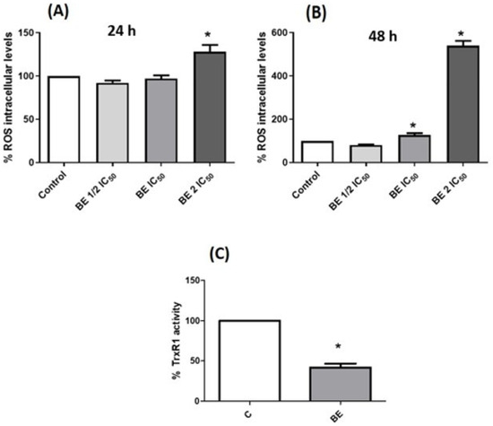 Redox activity on Caco-2 cells with 750 (1/2 IC50), 1500 (IC50), or 3000 (2 IC50) μg/mL B. edulis extract (BE). Measurements of the intracellular levels of ROS at 24 (A) and 48 h (B) of incubation time respectively. Determination of the reductase activity of recombinant TrxR1 after incubation for 48 h with BE extract at IC50 concentration (C). * p < 0.05 compared to control (without treatment).