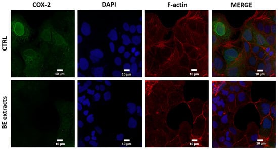 Caco-2 cells were seeded on sterile coverslips at a rate of 3 × 105 cells/cm2 and treated or not with BE extracts at the IC50 concentration for 48 h. After treatment, the cells were fixed for 15 min at room temperature in 4% paraformaldehyde (Alfa Aesar, Karlsruhe, Germany) after being rinsed with PBS. After fixation, the cells were successively cleaned with 0.1% saponin in BSA–PBS solution and 1% BSA in PBS. After that, the samples were incubated with a primary antibody against COX-2 (1:50; Abcam, Cambridge, UK) for an entire night at 4 °C. Subsequently, the cells were treated for one hour at room temperature with Alexa Fluor 488 goat anti-rabbit IgG antibody (1:250; Molecular Probes, Eugene, OR, USA). Phalloidin 546 (1:50; Molecular Probes, USA) was used to label f-actin in a PBS–BSA-saponin solution. Following that, 1% BSA in PBS and distilled water were used to wash the cells. Finally, coverslips were stained with 2 μg/mL of DAPI (Molecular Probes, USA) at 25 °C for 15 min before being mounted on glass slides with Mowiol mounting medium (Thermo Fisher, USA). Laser scanning confocal microscope (Leica TCS SP2, Wetzlar, Germany) was used to analyze the samples. The experiment was executed in triplicate.