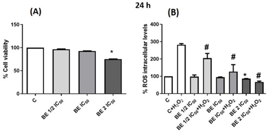 It is postulated that diseases such as cancer are related to the formation of free radicals and their derived reactive products [93]. Cancer cells exhibit heightened metabolic activity, which results in elevated ROS levels and the subsequent activation of signaling pathways or mitochondrial dysfunction [94]. The results of the present study demonstrated that BE extracts, following a 24 h incubation period, exhibited a pro-oxidant effect at concentrations that were twice as high as the IC50 (labelled as 2 IC50 in Figure 4A). After 48 h of incubation, the same pro-oxidant effect was observed even at IC50 concentrations (Figure 4B).