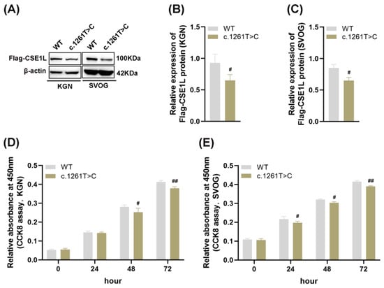 Mutant CSE1L (c. 1261T>C) inhibited the viability of human granulosa cells. (A) Flag–CSE1L protein expression in KGN and SVOG cells transfected with mutant CSE1L (c. 1261T>C) plasmid was detected by Western blotting. (B,C) Quantification of band intensity of Flag–CSE1L/β–actin ratios in KGN and SVOG cells. (D,E) Cell viability in KGN and SVOG cells was detected by CCK8 assay. N = 3 for each group. Data were expressed as mean ± SD. # p < 0.05 compared to WT, ## p < 0.01 compared to WT.