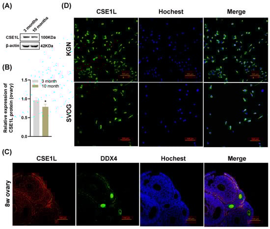 The expression of CSE1L was downregulated in aged mice ovaries. (A) CSE1L protein expression in ovaries was detected by Western blotting. (B) Quantification of band intensity of CSE1L/β–actin ratios in ovaries. (C) Localization of CSE1L in the 8w ovary. Immunofluorescence staining of CSE1L (red), DDX4 (green) in ovary were analyzed by confocal microscopy. Nuclei were counterstained with Hochest (blue). Scale bar: 100 µm. (D) Cell localization of CSE1L in KGN and SVOG cell. Immunofluorescence staining of CSE1L (green), Nuclei (blue) in cells were analyzed by confocal microscopy. Scale bar: 100 µm. N = 3 for each group. Data were expressed as mean ± SD. * p < 0.05 compared to 3–month–old mice.