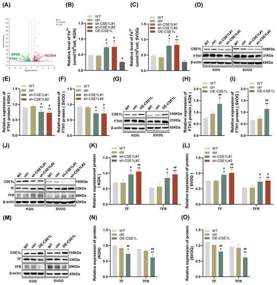 CSE1L silence affected iron metabolism in human granulosa cells. (A) Volcano plot of differentially expressed genes (Q value ≤ 0.05, |log2FC| ≥ 1). (B,C) Ferrous iron level in KGN and SVOG cells transfected with sh–CSE1L or CSE1L overexpression of the lentivirus. (D) FTH1 protein expression in KGN and SVOG cells transfected with sh–CSE1L was detected by Western blotting. (E,F) Quantification of band intensity of FTH1/β–actin ratios in KGN and SVOG cells transfected with sh–CSE1L. (G) FTH1 protein expression in KGN and SVOG cells transfected with CSE1L overexpression of the lentivirus was detected by Western blotting. (H,I) Quantification of band intensity of FTH1/β–actin ratios in KGN and SVOG cells transfected with CSE1L overexpression of the lentivirus. (J) TF, TFR protein expression in KGN and SVOG cells transfected with sh–CSE1L was detected by Western blotting. (K,L) Quantification of band intensity of TF/β–actin, TFR/β–actin ratios in KGN and SVOG cells transfected with sh–CSE1L. (M) TF, TFR protein expression in KGN and SVOG cells transfected with CSE1L overexpression of the lentivirus was detected by Western blotting. (N,O) Quantification of band intensity of TF/β–actin, TFR/β–actin ratios in KGN and SVOG cells transfected with CSE1L overexpression of the lentivirus. N = 3 for each group. Data were expressed as mean ± SD. # p < 0.05 compared to WT, ## p < 0.01 compared to WT. * p < 0.05 compared to ctrl, ** p < 0.01 compared to ctrl.