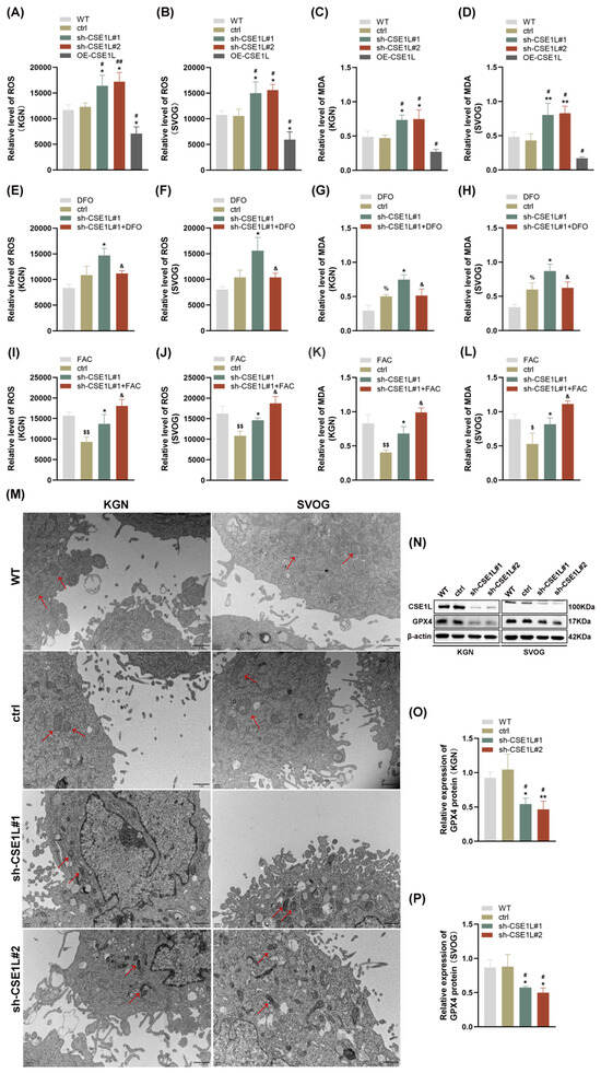 CSE1L silence induced ferroptosis in human granulosa cells. (A,B) ROS level in KGN and SVOG cells transfected with sh–CSE1L or CSE1L overexpression of the lentivirus. (C,D) MDA level in KGN and SVOG cells transfected with sh–CSE1L or CSE1L overexpression of the lentivirus. (E–H) ROS and MDA level in KGN and SVOG cells treated with DFO. (I–L) ROS and MDA level in KGN and SVOG cells treated with FAC. (M) Images from TEM showing morphology of mitochondria (red arrows) in human granulosa cells transfected with sh–CSE1L. Scale bar: 1 µm (N) GPX4 protein expression in KGN and SVOG cells transfected with sh–CSE1L was detected by Western blotting. (O,P) Quantification of band intensity of GPX4/β–actin ratios in KGN and SVOG cells transfected with sh–CSE1L. N = 3 for each group. Data were expressed as mean ± SD. # p < 0.05 compared to WT, ## p < 0.01 compared to WT. * p < 0.05 compared to ctrl, ** p < 0.01 compared to ctrl. % p < 0.05 compared to cells treated with DFO. $ p < 0.05 compared to cells treated with FAC, $$ p < 0.01 compared to cells treated with FAC. & p < 0.05 compared to cells transfected with sh–CSE1L#1.