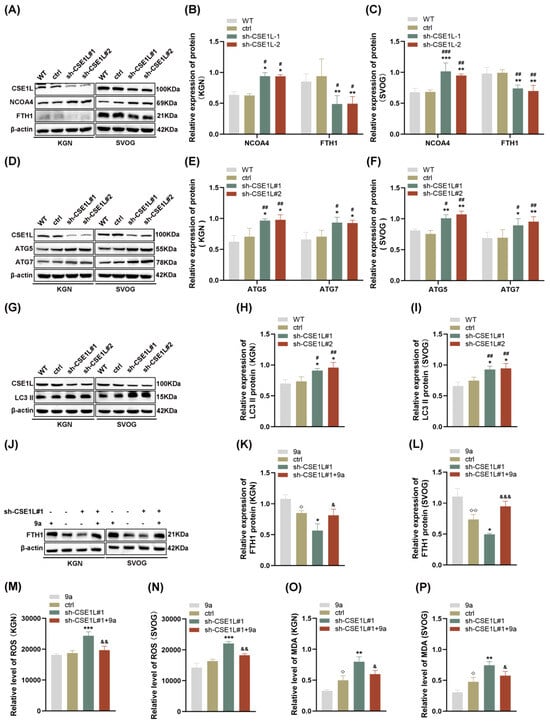 CSE1L silence promoted ferroptosis via activating NCOA4–mediated ferritinophagy. (A) NCOA4, FTH1 protein expression in KGN and SVOG cells transfected with sh–CSE1L was detected by Western blotting. (B,C) Quantification of band intensity of NCOA4/β–actin, FTH1/β–actin ratios in KGN and SVOG cells transfected with sh–CSE1L. (D) ATG5, ATG7 protein expression in KGN and SVOG cells transfected with sh–CSE1L was detected by Western blotting. (E,F) Quantification of band intensity of ATG5/β–actin, ATG7/β–actin ratios in KGN and SVOG cells transfected with sh–CSE1L. (G) LC3 II protein expression in KGN and SVOG cells transfected with sh–CSE1L was detected by Western blotting. (H,I) Quantification of band intensity of LC3 II/β–actin ratios in KGN and SVOG cells transfected with sh–CSE1L. (J) FTH1 protein expression in KGN and SVOG cells treated with 9a was detected by Western blotting. (K,L) Quantification of band intensity of FTH1/β–actin ratios in KGN and SVOG cells treated with 9a. (M–P) ROS and MDA level in KGN and SVOG cells treated with 9a. N = 3 for each group. Data were expressed as mean ± SD. # p < 0.05 compared to WT, ## p < 0.01 compared to WT, ### p < 0.001 compared to WT. * p < 0.05 compared to ctrl, ** p < 0.01 compared to ctrl, *** p < 0.001 compared to ctrl. ◇ p < 0.05 compared to cells treated with 9a, ◇◇ p < 0.01 compared to cells treated with 9a. & p < 0.05 compared to cells transfected with sh–CSE1L#1, && p < 0.01 compared to cells transfected with sh–CSE1L#1, &&& p < 0.001 compared to cells transfected with sh–CSE1L#1.