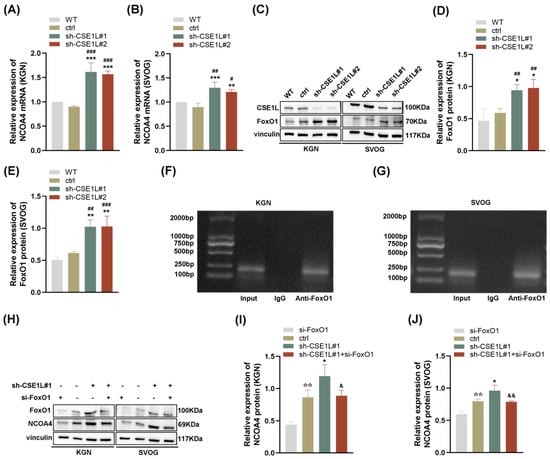 FoxO1 promoted the transcription of NCOA4. (A,B) NCOA4 mRNA expression in KGN and SVOG cells transfected with sh–CSE1L was detected qRT–PCR. (C) FoxO1 protein expression in KGN and SVOG cells transfected with sh–CSE1L was detected by Western blotting. (D,E) Quantification of band intensity of FoxO1/vinculin ratios in KGN and SVOG cells transfected with sh–CSE1L. (F,G) ChIP assay was conducted in KGN and SVOG cells. (H) NCOA4 protein expression in KGN and SVOG cells transfected with si–FOXO1 was detected by Western blotting. (I,J) Quantification of band intensity of NCOA4/vinculin ratios in KGN and SVOG cells transfected with si–FoxO1. N = 3 for each group. Data were expressed as mean ± SD. # p < 0.05 compared to WT, ## p < 0.01 compared to WT, ### p < 0.001 compared to WT. * p < 0.05 compared to ctrl, ** p < 0.01 compared to ctrl, *** p < 0.001 compared to ctrl. ☆☆ p < 0.01 compared to cells transfected with si–FoxO1. & p < 0.05 compared to cells transfected with sh–CSE1L#1, && p < 0.01 compared to cells transfected with sh–CSE1L#1.