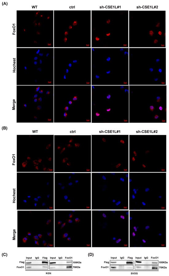 Given that NCOA4 was significantly increased in human granulosa cells transfected with sh–CSE1L, we speculated that the increased expression of NCOA4 was mainly caused by mRNA synthesis. Then, a qRT–PCR assay was performed. As expected, the NCOA4 mRNA level was significantly upregulated in cells transfected with sh–CSE1L (Figure 7A,B). To further investigate the underlying mechanism, the UCSC Genome Browser database was used to predict the potential transcription factors of NCOA4. Among them, FoxO1 aroused our interest. It is worth noting that FoxO1 is crucial to follicular development, granulosa cell proliferation, and autophagy [31]. Lin et al. [32] demonstrated that the overexpression of FoxO1 could induce granulosa cell apoptosis via upregulating FasL. Herein, we found that the expression of FoxO1 was upregulated by sh–CSE1L (Figure 7C–E). Next, the JASPAR database was used to predict the potential binding motif, and a ChIP assay was performed to verify it. As shown in Figure 7F,G, FoxO1 could bind to the NCOA4 promoter at the predicted binding motif (GAACACAGGA). To further investigate the effect of FoxO1 on NCOA4, si–FoxO1 was used. The results showed that si–FoxO1 could partially alleviate the increased NCOA4 induced by sh–CSE1L (Figure 7H–J). We actually know that only when the transcription factor enters the nucleus can it promote the transcription of the downstream targets. Given that CSE1L played an important role in maintaining cellular homeostasis via regulating the exportation of various cargoes from the nucleus to the cytoplasm [4], the nucleocytoplasmic transportation of FoxO1 was examined later. As expected, the loss of CSE1L indeed led to the excessive accumulation of FoxO1 in the nucleus (Figure 8A–B). Furthermore, coimmunoprecipitation (Co–IP) confirmed the direct interaction between CSE1L and FoxO1 (Figure 8C,D). Thus, these results demonstrate that CSE1L participated in ferritinophagy by affecting the nucleocytoplasmic transportation of FoxO1.