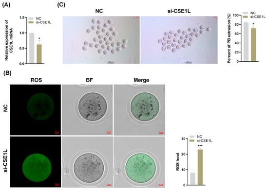 Inhibition of CSE1L in cumulus cell monolayer impeded oocyte maturation. (A) CSE1L mRNA expression in mice granulosa cells transfected with si–CSE1L was detected by qRT–PCR. (B) ROS levels of co–cultured oocytes. Scale bar: 10 µm. (C) The first polar body extrusion rate of co–cultured oocytes. Scale bar: 100 µm. N = 3 for each group (Each replication included at least 30 oocytes). Data were expressed as mean ± SD. * p < 0.05 compared to NC, *** p < 0.001 compared to NC.