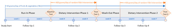 This study employs a randomized crossover design to explore the impact of various combinations of F and Vs, along with an overall increase in consumption, on biomarkers of chronic diseases in healthy human volunteers (Figure 1). The study spanned 7 weeks. Each participant started with a 2-week run-in period, followed by a 2-week intervention phase, a 1-week washout period, and, finally, another 2-week intervention phase. The run-in period was designed to standardize everyone’s F and V intake to the same, low level of 50 g per day so that baseline intake levels were uniform across all participants, and so that the effects of increasing F and V intake at recommended levels during intervention phases (450 g per day) were more likely to be identifiable within a 2-week duration. Participants were randomized to receive two out of seven distinct nutrition interventions, and the 1-week washout phase was added to mitigate any potential carry-over effect from the first intervention into the second intervention phase, a duration validated by a prior study [18].