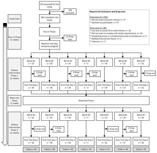 Randomization was calculated using computer-generated random numbers in Microsoft Excel (2016) described previously [40]. The random allocation sequence, participant enrollment, and participant assignment were performed by the coordinating investigator. Participant assignment occurred 48 h prior to the first (baseline) test day to allow for the preparation of the intervention product for subsequent distribution. Participants were blinded to the ingredients contained in the dietary interventions, as the bottles were only labeled with the intervention number, and ingredients were blended into a homogenous mixture.