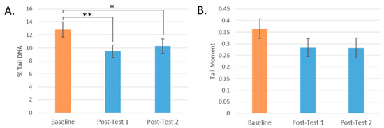 Changes in DNA strand breaks by test day. (A): % DNA in Tail by test day. (B): Tail Moment by test day. (* = p < 0.05, ** = p < 0.005. Mean values are presented and the error bars represent the SEM).