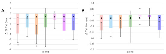 The post-intervention tail moment measurements of participants who consumed Blends 5 and 6 did not differ much from baseline, and the largest change in mean from baseline was seen in participants who consumed Blend 1, the intervention highest in total flavonoids (−0.124, a reduction in Tail Moment by 34%, p = 0.068) (Figure 4B).