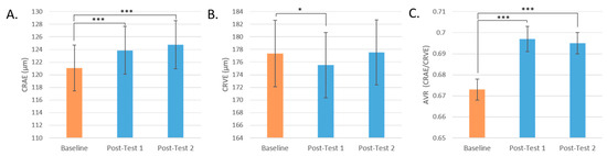 All test-day fundus images of a participant were measured together to ensure analysis consistency using MONA-REVA software (3.0.0 software, VITO, Mol, Belgium). The six largest arterioles and venules were outlined and, their caliber and AVR were calculated by the software. The means for each participant test day were recorded. The same researcher performed or validated all vessel-caliber analyses to prevent interrater variability.
