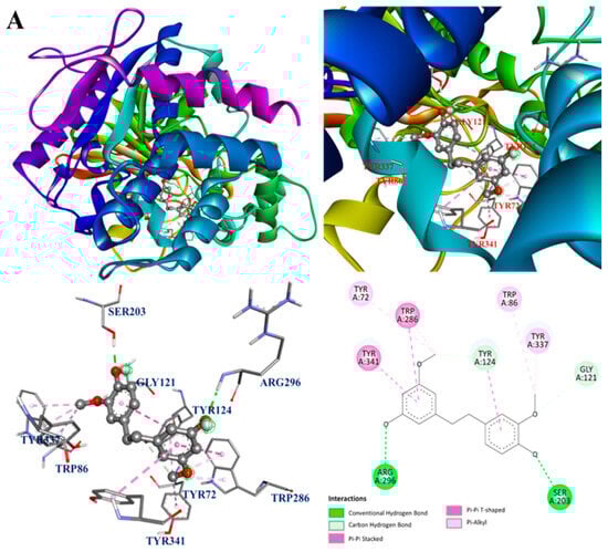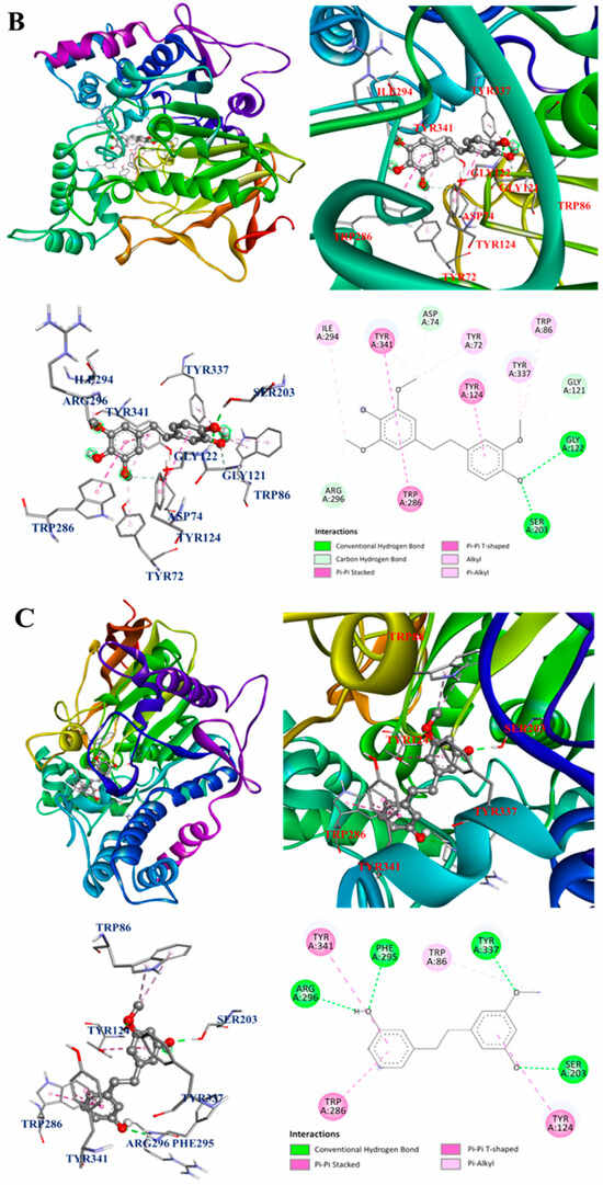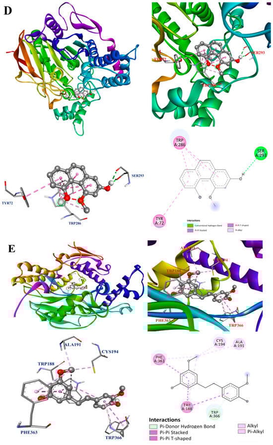 Since the main bioactive components of D. fimbriatum showed potent inhibitory activity against AChE and iNOS, further molecular docking analysis was carried out. The interactions between the bioactive components of D. fimbriatum and AChE and iNOS are shown in Figure 5A–H, and the molecular docking model of gigantol, dendrophenol, batatasin III, moscatin, and AChE is shown in Figure 5A–D. The interactions between active compounds and PDB: 1C2B were displayed in the best docked poses for the calculations. According to the results of the acetylcholinesterase inhibitory effect test (Table 5) and binding energy results (Table 8), moscatin had anti-AChE effect potential. Moscatin (Figure 5D) formed a conventional hydrogen bond with Ser293 of AChE and bound to Tyr72 of AChE via π-π T-shaped interactions. Additionally, π-π stacked interactions and π-alkyl interactions were found with Trp286 of AChE. Interestingly, gigantol (1) and moscatin (2) were both bound to acetylcholinesterase, exhibiting the same binding energies (BE = −8.6 kcal/mol) (Table 8). However, as shown in Table 5, moscatin (IC50 = 161.86 ± 16.45 μM) demonstrated better anti-AChE activity than gigantol (IC50 = 176.05 ± 19.08 μM). Therefore, binding energy (Table 8) was the calculated estimated value of molecular docking, which may sometimes be slightly different from the experimental value. Furthermore, according to bioaffinity ultrafiltration and HPLC analysis (Figure 4), moscatin (66.31%) exhibited higher binding affinity (EF) to acetylcholinesterase than gigantol (54.60%) (Table 8).