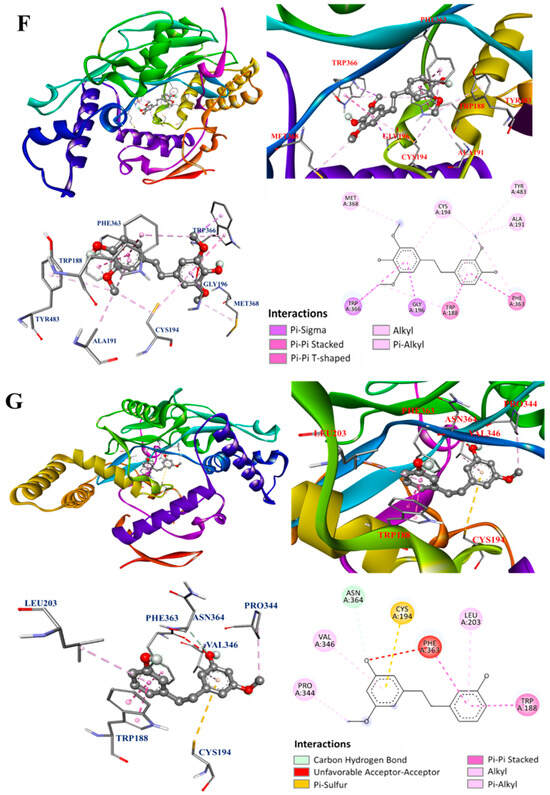 Based on the results of the NO production inhibition test (Table 7) and the Western blotting results of the related protein, inducible nitric oxide synthase (iNOS) (Figure 3), both active compounds (moscatin and dendrophenol) exhibited anti-inflammatory potential. As shown in Figure 5F, the compound was dendrophenol, which bound to iNOS through π-sigma interactions with Trp366 and Gly196 and π-alkyl interactions with Ala191, Cys194, Tyr483, and Met368.