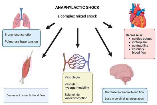 AS is usually described as a distributive shock with complex pathophysiology. Clinical signs may manifest as chest pain, tachycardia, arterial hypotension, vascular collapse, bronchoconstriction, or cardiac arrest. The massive release of vasoactive mediators, including histamine, platelet activating factor, nitric oxide, and arachidonic acid metabolites, leads to the effects on the cardiovascular system: vasoplegia, vascular hyperpermeability, and finally a profound hypovolemia. These mediators also affect bronchial smooth muscle, resulting in bronchoconstriction. A genuine cardiac dysfunction occurs during AS and results either from the direct action of anaphylactic mediators or from the hypovolemia and decrease in preload or from epinephrine side effects, including stress cardiomyopathy or Takotsubo syndrome.