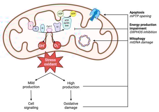 Illustration of mitochondrial ROS production and the deleterious effects of high production on mitochondrial functions. ADP: adenosine diphosphate; ATP: adenosine triphosphate; mPTP: mitochondrial permeability transition pore; mtDNA: mitochondrial DNA; O2•−: superoxide anion; OH•: hydroxyl radical; OXPHOS: oxidative phosphorylation; I: complex I; II: complex II; III: complex III; IV: complex IV; cyt c: cytochrome c.