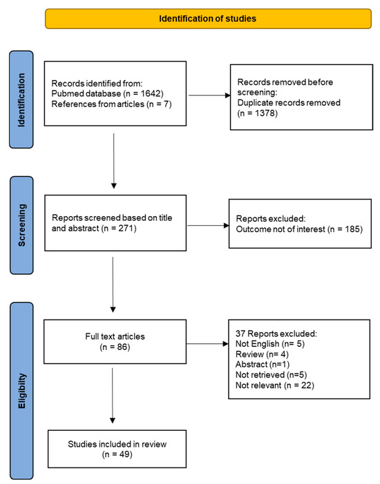 The flow chart for the study selection is provided in Figure 4. A total of 271 unique titles and abstracts were evaluated, from which 185 references were excluded because they were irrelevant to the systematic review topic. The remaining 86 full-text articles were analyzed for eligibility. Out of those, 15 articles were excluded because they do not meet selection criteria and 22 articles were removed because the outcome was not relevant. Finally, the full review process yielded a total number of 49 studies included in the systematic review.