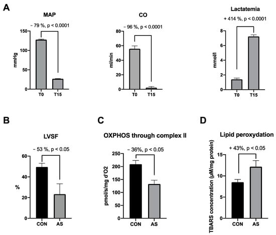 Major effects of AS on hemodynamic, cardiac and mitochondrial functions focused on cardiac dysfunctions, selected from the literature. (A) Hemodynamic impairments and increase in lactatemia in AS group between T0 and T15 min [5,94]. At T15 min we observe in AS group a (B) cardiac contractility decrease [86], a (C) cardiac mitochondrial impairment through complex II [5,86] and a (D) cardiac lipid peroxidation increase [5] as compared with CON group. MAP: mean arterial pressure, CO: cardiac output, LVSF: left ventricle shortening fraction, OXPHOS: oxidative phosphorylation, CON: control group, AS: shocked group, TBARs: thiobarbituric acid reactive substances.