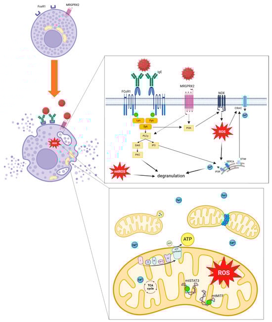 As previously detailed, mitochondrial respiratory complex chain integrity and mitochondrial membrane potential are essential for optimal mast cell degranulation. IgE and non-IgE mast cell stimulation tends to enhance OXPHOS through complexes I and III, leading to increased mitochondrial ATP production and allowing degranulation. More precisely, after allergen stimulation through IgE receptor FcεRI, activation of Lyn, Fyn and Syk kinases promotes activation of PLCγ and PI3K. PLCγ generates DAG and IP3, leading to calcium-dependent degranulation. IP3 binds to its receptors IP3R on endoplasmic reticulum and induces Ca2+ release. PI3K promotes ROS production through NOX activity. MRGPRX2 activation should promotes PI3K and PLCγ activation. Increase in intracellular Ca2+ induces granules exocytosis. ROS regulates mast cell degranulation through Ca2+ flux from endoplasmic reticulum and extracellular influx by CRAC. mtROS regulates PKC phosphorylation, leading to degranulation. Mast cell activation induces mitochondrial fragmentation, morphological changes and translocation of mitochondria from perinuclear region to the cell surface. Phosphorylation of the two transcriptional factors STAT3 and MITF induces mitochondrial respiration, production of ATP and mitochondrial ROS, promoting mast cell degranulation (Figure 6).