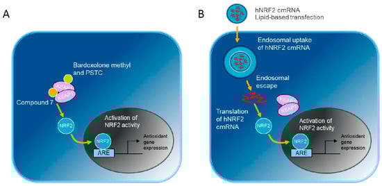 NRF2 activation strategies compared in this study: (A) Small molecules targeting KEAP1 inhibit NRF2-KEAP1 interaction. (B) Alternatively, hNRF2 cmRNA transfection results in endosomal uptake of the cmRNA-lipid nanoparticle. Following endosomal escape, the hNRF2 cmRNA is translated into NRF2 protein. Both pathways culminate with NRF2 translocation into the nucleus and upregulation of antioxidant gene expression.