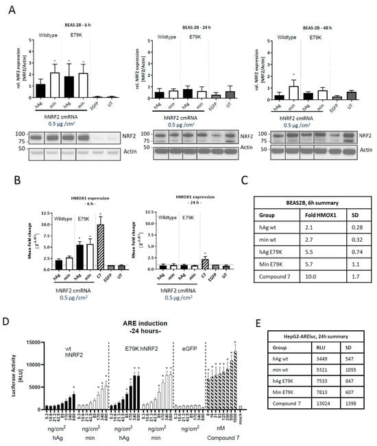 Functional NRF2 expression from hNRF2 cmRNA in human cell lines. (A) NRF2 protein expression following transfection of hNRF2 cmRNAs in BEAS-2B cells. The full Western blot images were cropped to the relevant NRF2 band. (B) HMOX1 gene expression following transfection of hNRF2 cmRNAs in BEAS-2B cells. Data are pooled results from 3 independent experiments showing mean ± SD. * p < 0.05; ordinary one-way ANOVA with Dunnett’s multiple comparisons against eGFP-transfected control at each timepoint. (C) Table detailing mean values from (B) and SD. (D) ARE-luciferase values 24 h after transfection of hNRF2 cmRNAs in ARE-luc HepG2 cells. * p < 0.05; ordinary one-way ANOVA with Dunnett’s multiple comparisons against 5.3 ng/cm2 eGFP-transfected control. (E) Table detailing mean maximum luciferase signal for each treatment group in (D) and SD.
