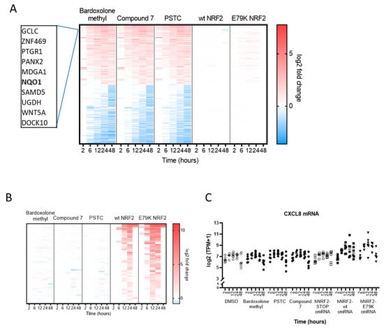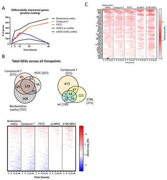 Protein-coding transcripts were selected for further analysis. Differentially expressed genes were identified by comparing Compound 7, Bardoxolone methyl, and PSTC against a DMSO-treated control at each timepoint, while each hNRF2 cmRNA was compared against the hNRF2 STOP cmRNA. Compound 7, Bardoxolone methyl, and PSTC treatments all resulted in a continually increasing number of differentially regulated transcripts (Figure 3A). Bardoxolone methyl resulted in the greatest number of genes regulated at the 48 h timepoint with 476 genes, as did PSTC (402 genes) and Compound 7 (396 genes). Transcriptional activity following hNRF2 wt cmRNA transfection peaked at 24 h with the maximum number of 94 regulated genes, but by 48 h, it had returned to baseline. The hNRF2 E79K cmRNA regulated a maximum of 209 transcripts at 12 h after transfection.