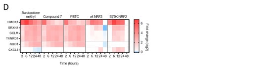Across all timepoints, Bardoxolone methyl regulated 757 transcripts in total, PSTC regulated 557, and Compound 7 regulated 571, compared to 130 transcripts from hNRF2 wt cmRNA and 271 transcripts from hNRF2 E79K cmRNA (Figure 3B). A total of 1184 genes were differentially regulated in any treatment group at at least one timepoint. A total of 37 protein-coding transcripts were regulated by all treatment groups at at least one timepoint (Figure 3C).