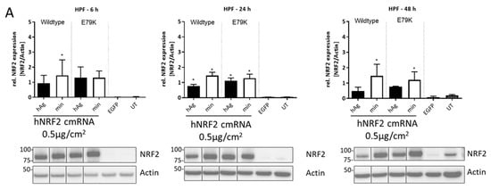 To test the expression and kinetics of NRF2 protein translation, a lung epithelial cell line (BEAS-2B) was transfected with the construct, and NRF2 protein expression was assessed between 6 and 48 h (Figure 2A). At 6 h after transfection, NRF2 expression increased for wt NRF2 with the min 5′ UTR as well as for mutant protein with both 5′ UTR sequences compared to eGFP-transfected control. At 24 and 48 h after transfection, NRF2 expression levels were equivalent to untransfected endogenous levels.