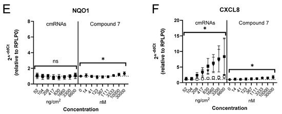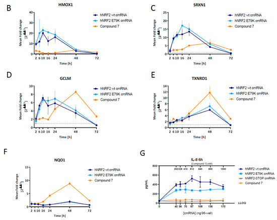 Secreted IL-8 protein was measured in the supernatant in this cell system. As NRF2 transcriptional activity was already observed at 6 h, IL-8 secretion was evaluated at this timepoint in a dose–response study. Significant IL-8 levels were detected in the supernatant at all doses in response to both hNRF2 cmRNA but not hNRF2 STOP cmRNA or Compound 7 (Figure 5G).