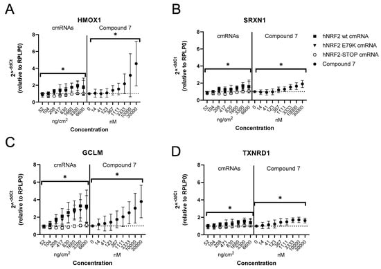 Cells were lysed using the SingleShot™ Cell Lysis Kit (Bio-Rad). For cell lysis, the cell culture medium was aspirated, and cells were washed twice with 300 μL D-PBS per well before the plates were frozen at −80 °C. An amount of 50 μL lysis buffer for RNA isolation was added per well and incubated for 10 min at RT. Subsequently, the cell lysate was transferred to a PCR plate. Protein and DNA were digested by incubation for 5 min at 37 °C followed by an incubation for 5 min at 75 °C. cDNA Synthesis was performed using iScript™ Select cDNA Synthesis Kit (Bio-Rad). The plates with the cell lysates were thawed on ice. All kit components, except iScript™ reverse transcriptase, were thawed on ice, mixed thoroughly, and centrifuged briefly. cDNA synthesis was performed using Oligo (dT) primers. An amount of 4 μL of the cell lysate was pipetted in a new PCR plate using a multi-channel pipet before adding 16 μL of the master mix on top. The plate was sealed using a cover foil and mixed gently at 400 rpm before the plate was spun down briefly. cDNA synthesis was performed using a thermal cycle. Universal probe library (Roche) was used for RT-qPCR to detect HMOX1, SRXN1, TXRND1, NQO1, and GCLM. ActB, HPRT1, and RPLP0 were used as reference genes. Sequences are listed in Supplemental Table S1. cDNA was thawed on ice, and 2 μL of cDNA was mixed with 2 μL RNAse-free water and pipetted in a LightCycler® 480 Multiwell Plate 96. Therefore, all components of the FastStart Essential DNA Probes kits were thawed. Components were mixed thoroughly, briefly spun down, and stored on ice. The master mix was added to the cDNA using a multi-pipette. The plate was covered with LightCycler® 480 Sealing Foil and spun down briefly. qPCR was performed using LightCycler® 96 System (Roche). For all statistical analyses, the comparison is to the relevant control (for cmRNAs, the hNRF2-STOP or eGFP controls; for small molecules, the DMSO control).