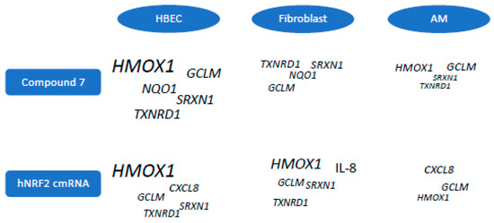 The commonly reported NRF2 target genes (HMOX1, SRXN1, TXNRD1, GCLM) all showed cell-type-specific preferences (Figure 7). Both bronchial epithelial cell systems strongly induced HMOX1 in response to both Compound 7 or hNRF2 cmRNAs. Alveolar macrophages responded to both stimuli with a stronger GCLM response than HMOX1. Fibroblasts strongly upregulated HMOX1 in response to hNRF2 cmRNA transfection, but it was not detectable in response to Compound 7 at the timepoints tested.