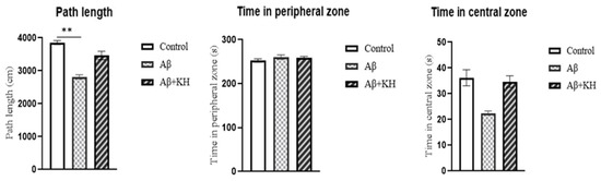 Path length was the distance covered within the arena and represented the locomotor activity of the study rats. The Aβ group had a significantly shorter path length compared to controls (p = 0.0013). Moreover, the path length in the Aβ+KH group was statistically insignificant compared to the control group (p = 0.281). Next, the thigmotaxic behavior was analyzed. The amount of time spent in the central zone is inversely proportional to anxiety, which means the more time a rat spent in the central zone, the less anxious it was. The results of the OFT showed that the time spent in the peripheral zone was similar among the three groups. In comparison, less time was spent in the central zone by the Aβ group compared to the control, however, the difference was not statistically significant (p = 0.336) (Figure 1).