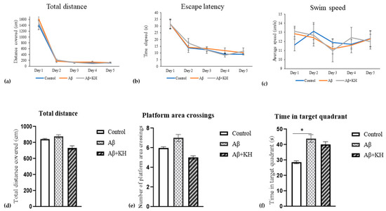 Results of the training days. (a) Total distance (b), escape latency, (c) swim speed, and probe test (d) total distance covered, (e) number of times the platform area was crossed, and (f) the time spent in target quadrant. * p < 0.05.