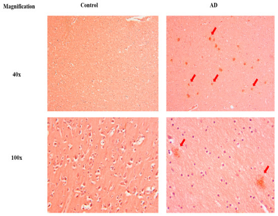 Congo-red-stained human brain with (AD brain) and without AD (control brain). The orange-red stained amyloid plaques can be seen in 40× and 100× magnification (red arrows).