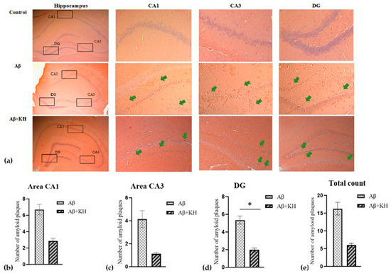 (a) Congo-red-stained control, Aβ, Aβ+KH groups (magnification 40×). The areas CA1, CA3, and DG are further enlarged (magnification 100×) to show the amyloid plaques (green arrows). Congo-red-stained amyloid plaque count in areas (b) CA1, (c) CA3, (d) DG and (e) the total count in all regions combined. * p < 0.05.