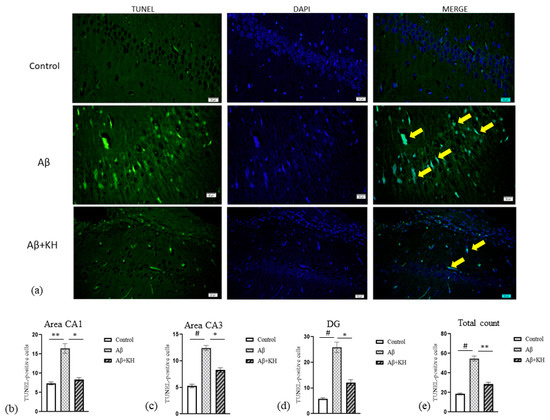 (a) TUNEL assay of area CA1 of control, Aβ, Aβ+KH groups (magnification 100×). Bright green TUNEL-positive cells appear turquoise green after merging with DAPI (yellow arrows). Number of TUNEL-positive cells in areas (b) CA1, (c) CA3, (d) DG, and (e) the total count in all three regions. * p < 0.05, ** p < 0.01, # p < 0.001.