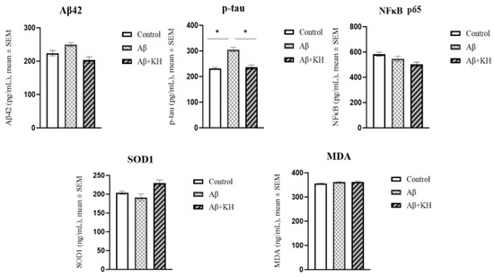 The ELISA results of p-tau showed a significantly increased concentration in the Aβ group compared to the control group (p = 0.016). The p-tau levels in Aβ were also significantly higher than in the Aβ+KH group (p = 0.038). Moreover, the KH supplementation appeared to have a preventive effect on p-tau as the levels in Aβ+KH were comparable to the controls (p = 0.863). Other ELISA tests (amyloid β42, SOD1, MDA, and NF-κB p65), however, did not show any difference between groups (Figure 6).