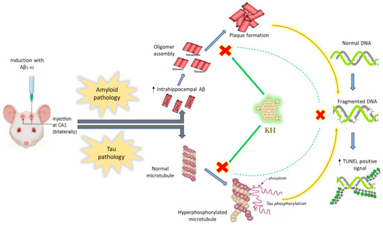 Possible mechanism of action of KH to ameliorate AD burden in amyloid β1–42 (Aβ1–42)-induced models. Figure showing Aβ1–42 intrahippocampal injection initiating amyloid and tau pathologies with subsequent formation of amyloid plaques and p-tau (leading to microtubule dysfunction); both the pathological markers later cause DNA damage (evident as increased TUNEL-positive signals). The KH treatment likely targets plaque formation and tau hyperphosphorylation (shown with the red cross) that ultimately results in decreased neuronal apoptosis (shown with dotted green line).